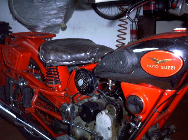 Acquistata assieme al Nettuno che si vede più avanti con documenti "strani" , bicolore, nel senso che era di due rossi diversi con strani rumori dal motore. Rivista totalmente di carrozzeria e risolti i rumori: erano consumati i rullini che poggiano sull'albero a cammes è stata reimmatricolata .... purtroppo con targa europea . Per una moto del 1939 quasi una sciagura!!